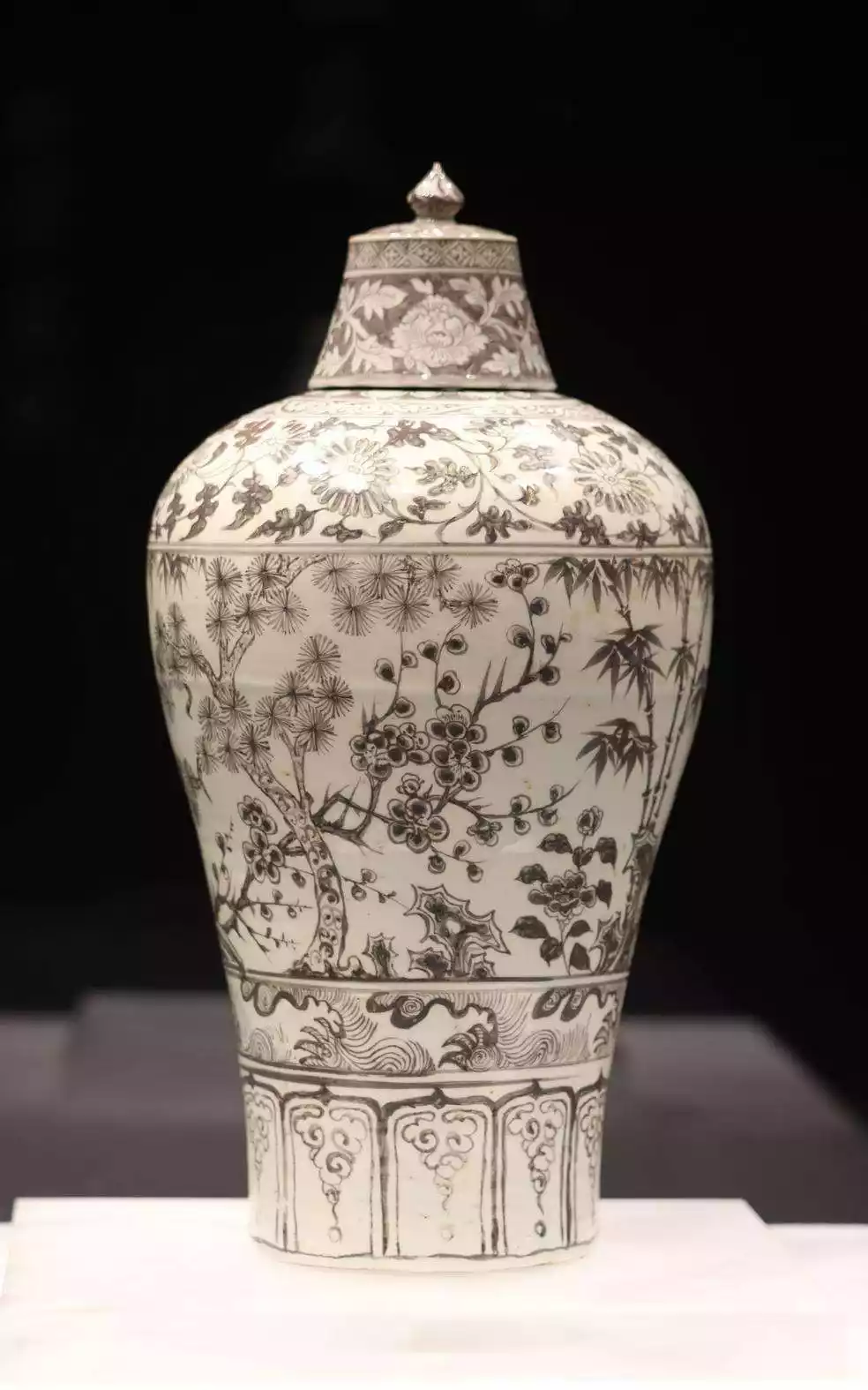 This plum vase is a product of the official kiln. It is 41.7 cm high, with an elegant shape and intact form. The Three Friends of Winter refers to the evergreen plants of pine, bamboo and plum blossom, symbolizing noble aspirations and was a common subject in Yuan Dynasty literati paintings.