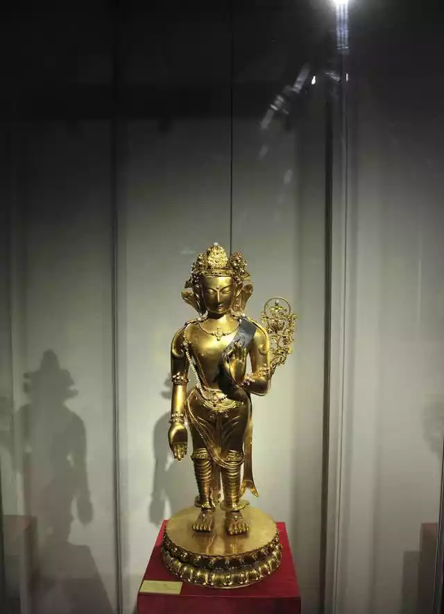 The cultural relic is 88 centimeters tall and is made of 41 kilograms of pure gold. It is also embellished with many pearls and gems. The Buddha's body and lotus seat are both gorgeously decorated and inlaid with pearls and gems. It is elegant and luxurious, showing the royal style. It should have been made by skilled craftsmen in the court during the heyday of the Qing Dynasty.