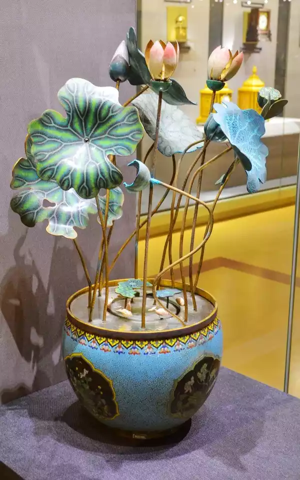 The surface of the jar, mirrored by glass, depicts a tranquil water surface, resembling a lotus pond. Ducks form a circle in the center, while graceful lotus flowers are scattered throughout. Several lotus flowers are arranged in a staggered pattern. Three of the lotus flowers can open and close, revealing the Queen Mother of the West, a boy holding a peach, and a white ape holding a peach. When activated, the petals open to the accompaniment of music, revealing the Queen Mother of the West, the boy, and the ape within. The Queen Mother sits motionless, while the boy and the white ape kneel in worship, presenting a peach.