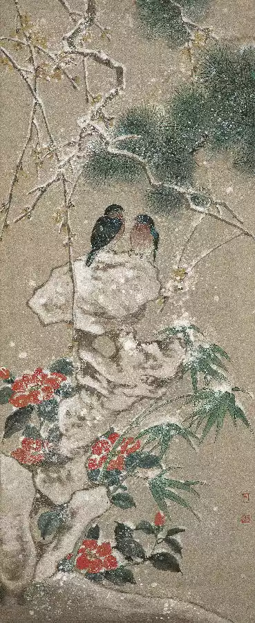 The same is true for depicting snow scenes. Before the founding of New China, the picture used elegant and cool brushstrokes and colors to reveal the bleak and desolate beauty of the silent falling snow. In the new era, the snow scene is still depicted using the "snow-playing method". However, in terms of color matching, Chen Zhifo deliberately added bright colors such as red and green. The combination of the red hibiscus flowers, green bamboo and pine needles in the picture makes the whole painting exude a hint of warmth.
