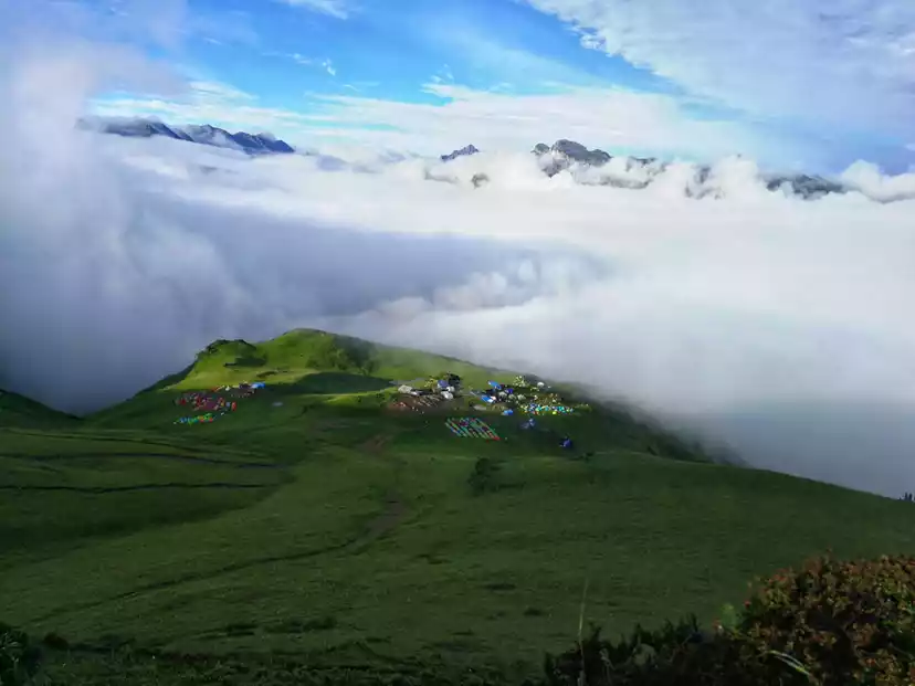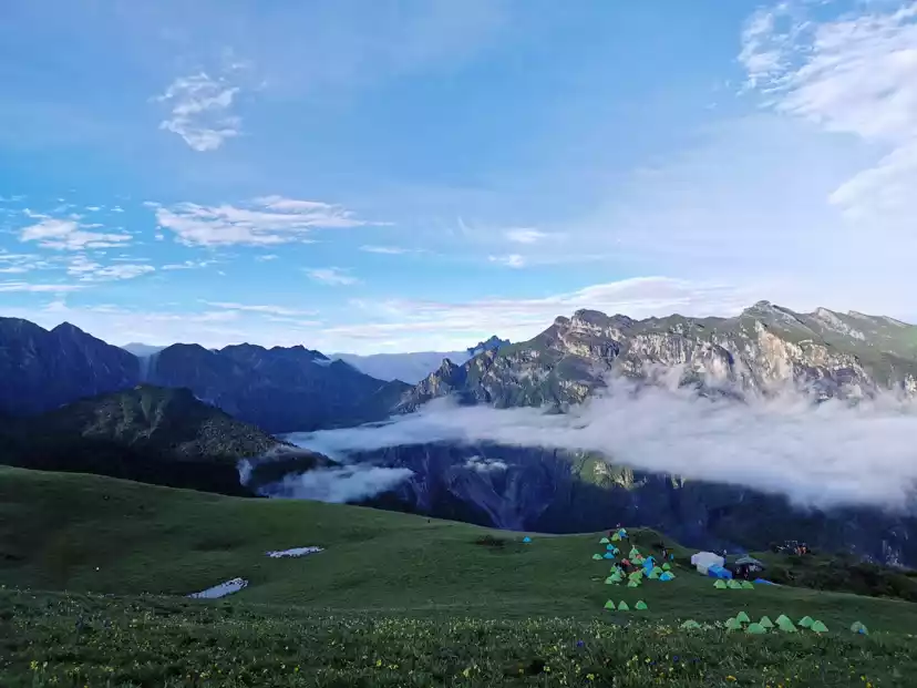 Sichuan is home to many immortal mountains, with Jiuding, a mountain known for its unique beauty, and Jizhaopeng (Chicken Claw Shed) is nestled among them. Not only is the area covered in vast meadows, but the Black Dragon Pond, a 40-minute hike away, is also known as the Pearl of the Plateau. Descending on the other side of the Black Dragon Pond, you can reach Bailong Pond, a route that weaves through alpine rhododendron forests, creating a rich ecological environment.