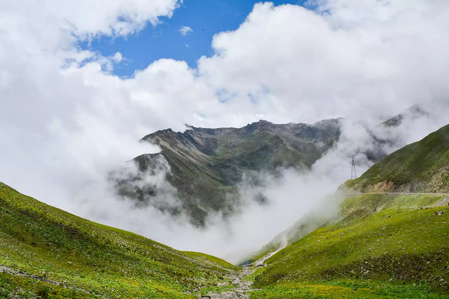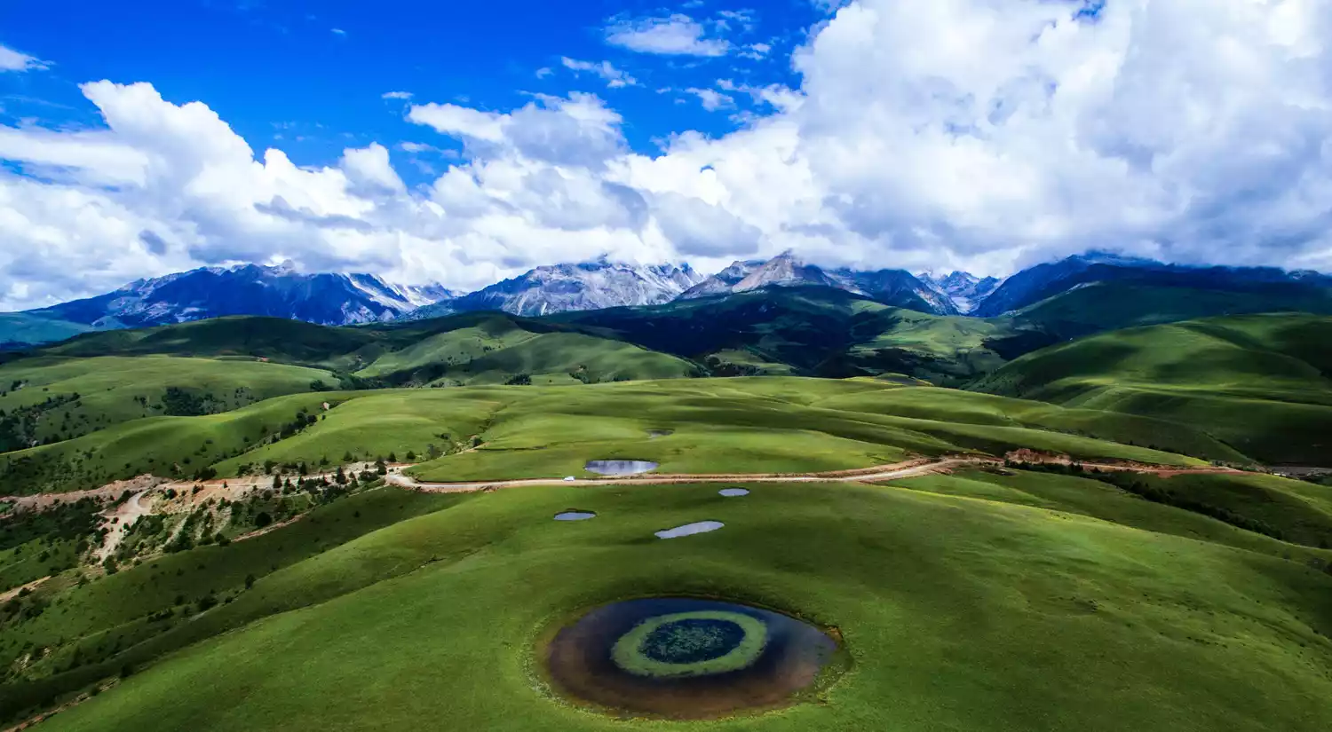 A small lake known as the Eye of Genyen is surrounded by flowers, while the undulating mountains in the distance resemble the most beautiful curves of the human body. Snow-capped mountains appear and disappear amidst this endless expanse of greenery, adding a touch of fairyland charm.