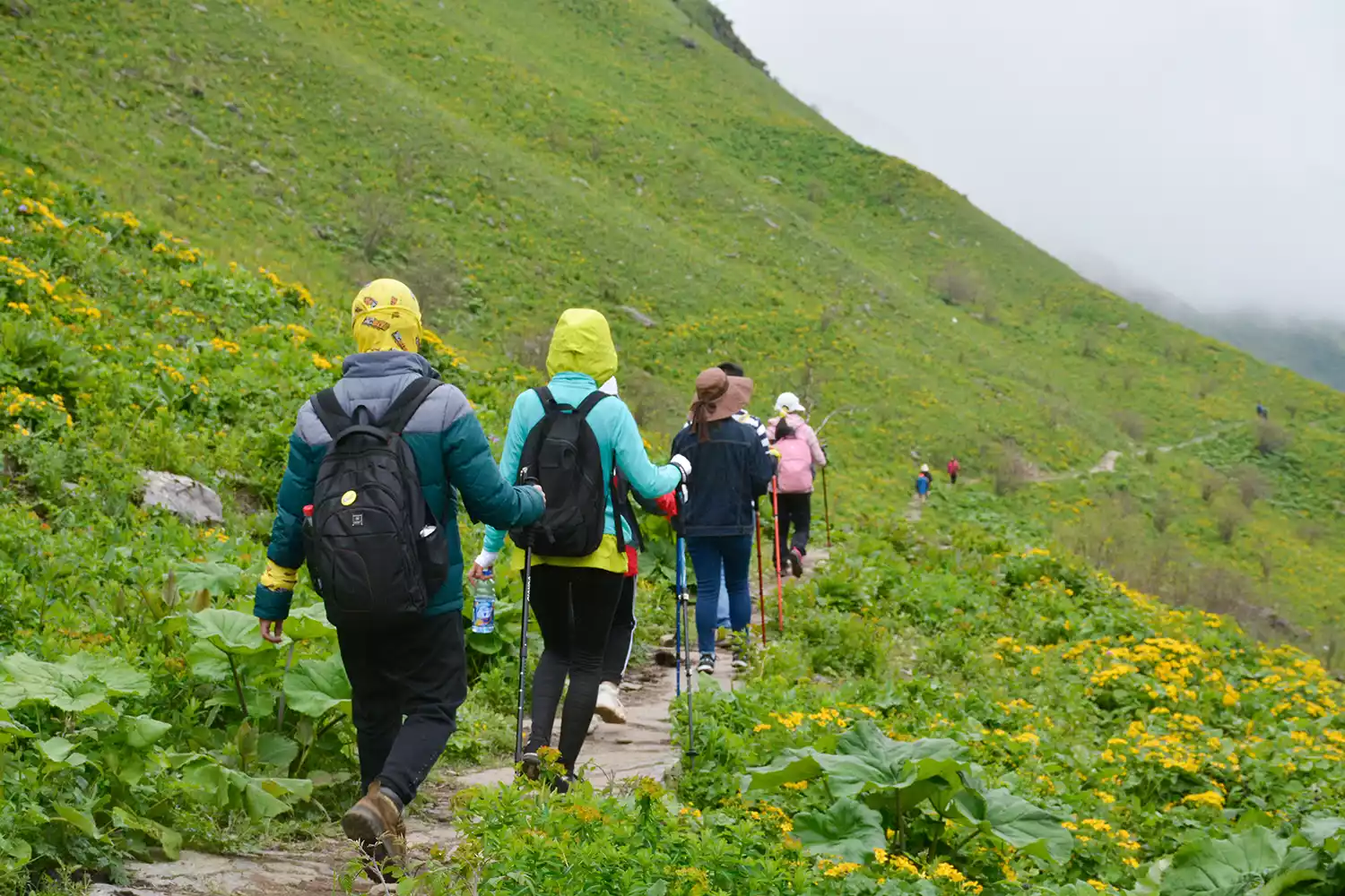 A natural grassland spanning from 4,200 meters to 2,900 meters above sea level. The huge height difference brings a variety of herbs, giant-leafed herbs, yellow, red, blue and purple wild flowers, scattered shrubs, trees with dense vines and winding paths, and tall trees are fully reflected in the entire route.