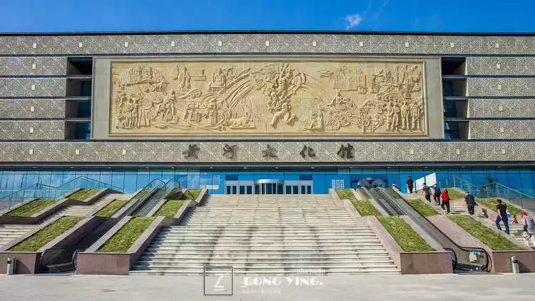 The Yellow River Cultural Center is located west of the intersection of Nan Er Road and Dong San Road in Dongying City. The magnificent four-story building faces south and sits north. Upon entering the center, a monumental landscape painting titled "The Yellow River Flows from the Snow-capped Mountains" hangs from the fourth floor to the first. The themes of the exhibitions on the second, third, and fourth floors are respectively "The Yellow River Flows from Heaven," "The Ten Thousand Miles of the Yellow River Nurture China," and "The Yellow River Flows into the Sea." The Yellow River originates from the snow-capped mountains, flows through the Qinghai-Tibet Plateau, deserts, Gobi Deserts, and grasslands, and then across the Central Plains to the sea.