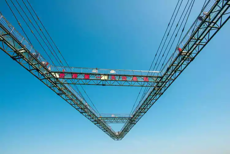 The world's longest glass corridor - the Sky Corridor. From a distance, the A-shaped corridor rises into the air, suspended on the cliff, extending outward for nearly 70 meters. It is made of fully transparent glass and is about 300 meters above the ground. It takes a certain amount of courage to set foot in the sky.