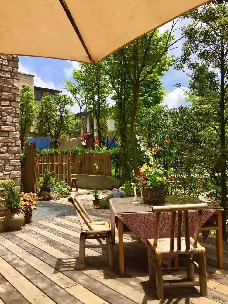 The interior decoration is mainly in a simple wooden style, fresh and natural, and very comfortable to live in. The large floor-to-ceiling windows allow sunlight to shine through the glass onto the bed and the courtyard above the clouds, starting a pleasant vacation time.