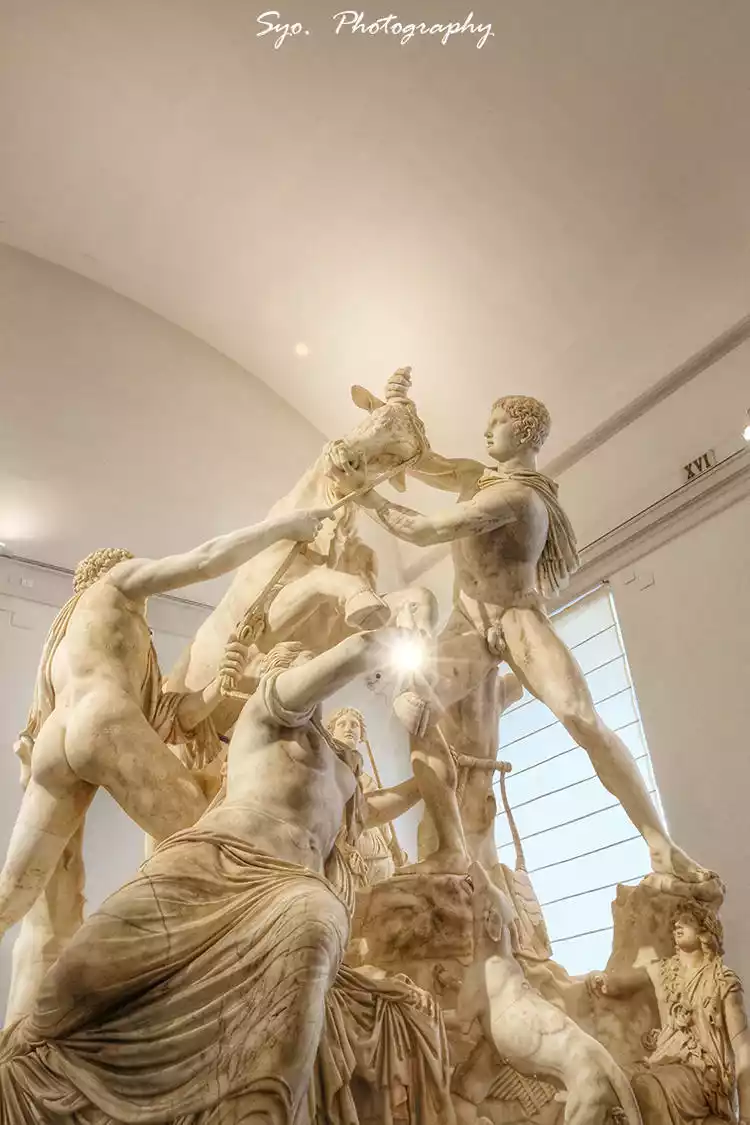 The largest marble sculpture, weighing 37 tons, was unearthed at the Baths of Caracalla in the summer of 1545. It depicts a tragic story: Queen Dir, driven by jealousy, torments Antimoque and orders two young men to kill her. Unaware that they are illegitimate twins of Antimoque and Zeus, a shepherd reveals this to them. They then tie Dir to the horns of an ox, holding the ox's head down. The mother urges her sons to restrain themselves, but they are enraged. One pulls her back, ready to throw her at the ox's feet, thereby executing Dir. The sculptor depicts this tense scene. The scene takes place in a mountainous area dedicated to Dionysus, hence the idyllic depiction at the foot of the figure. This sculpture may be from the Greek island of Rhodes or a Roman replica.