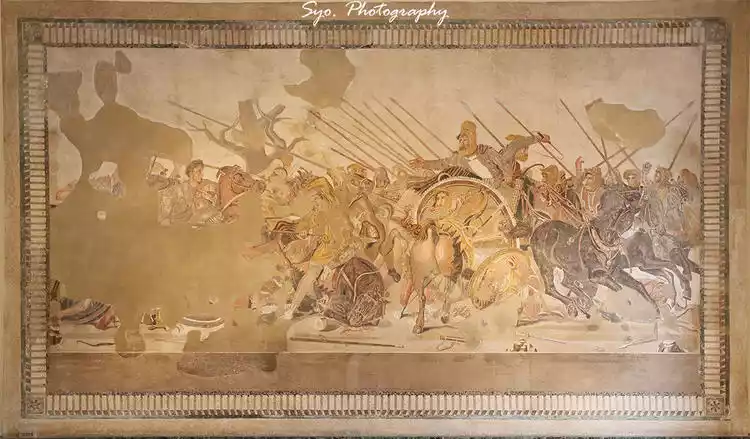 This floor mosaic, from the living room of the House of the Faun in Pompeii, depicts two kings leading their armies in battle. Careful research has confirmed that it depicts the Battle of Issus, during which Alexander the Great of Macedonia and Darius III of Persia fought.