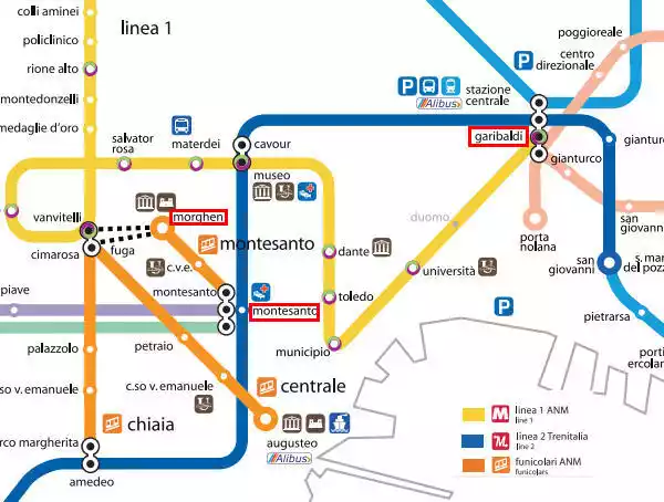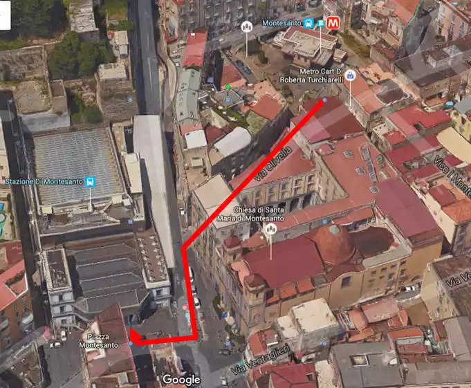 As one of the world's three most famous night views (along with Hakodate, Hong Kong, and Naples), the best place to see Naples at night is Castel Sant'Elmo. The viewpoint is located at Morghen Station, so no matter where you take the subway, you must first arrive at Montesanto Station, then take the cable car from Montesanto to Morghen Station. See the image below for a clearer view.