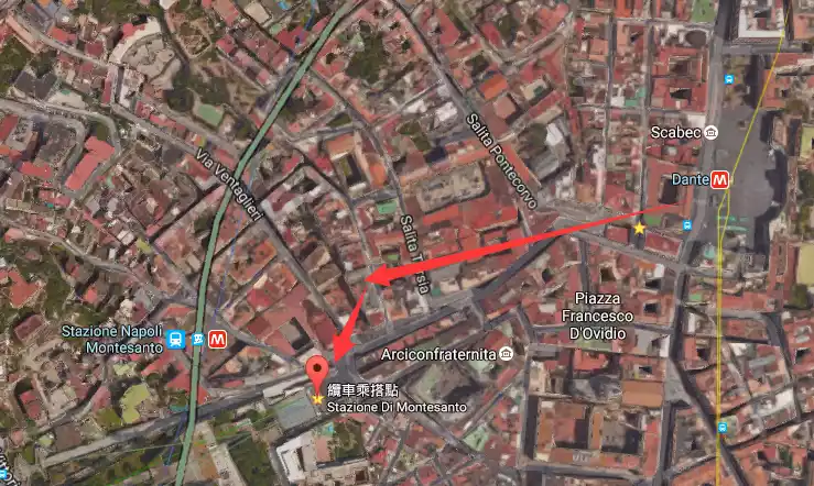 A one-way TIC ticket costs €1.50 and allows you to ride the metro and cable car for 90 minutes, so if you don't have an Artecard, be sure to check carefully! A Taiwanese user's guide shows you how to get from Garibaldi Station near the train station to Montesanto Station. Although the metro map above shows the two Montesanto stations connected, there's no connecting passage, so you need to walk a short distance after exiting the station to change trains. You can Google this route, but the full name of the Montesanto cable car station is actually: Stazione di Montesanto. See the image below: