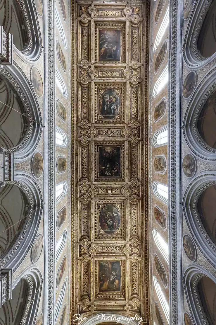 The Duomo of Naples was built in 1272 by order of Charles I of Anjou. Its spacious nave features a magnificent ceiling with inlaid ornamentation. Damaged by an earthquake in 1456, the cathedral underwent numerous reconstructions, ultimately achieving its current neo-Gothic appearance.