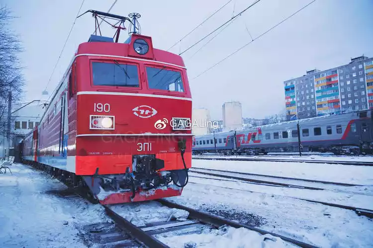 The train station is not far from McDonald's, right by the harbor, about a 15-minute walk in winter. The railway and trains are covered in snow.