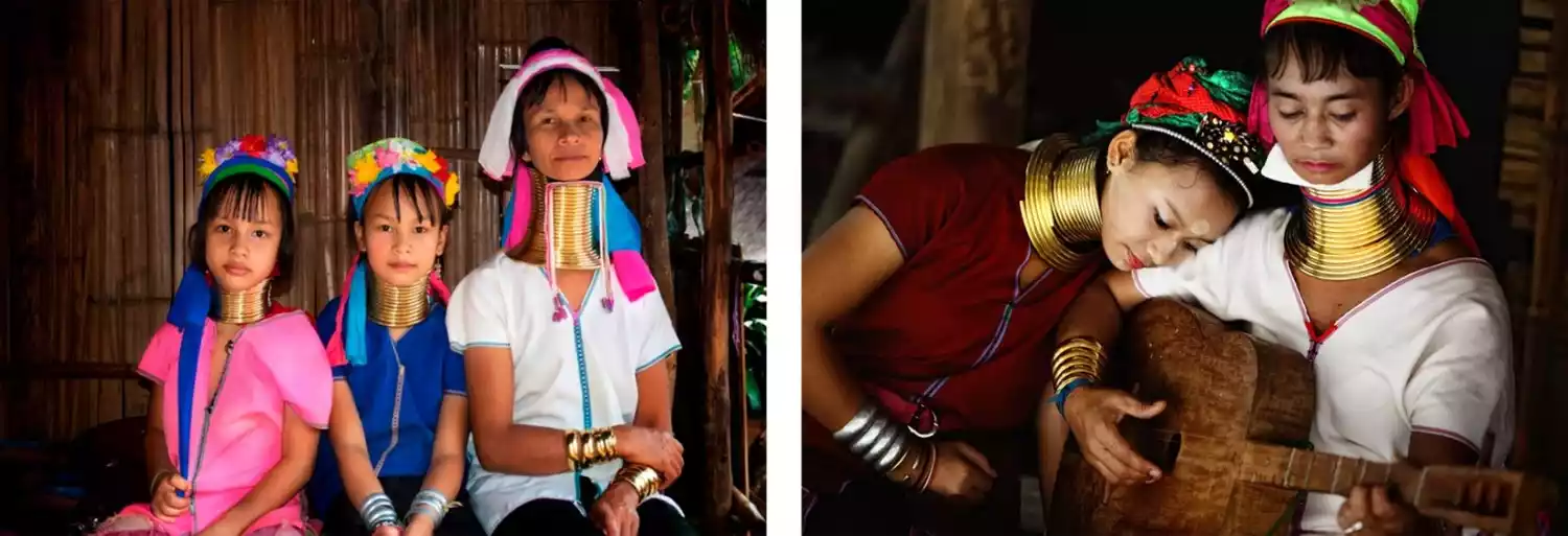 The long-necked people live in stilt-roofed thatched houses. Girls start wrapping copper rings around their necks, wrists, knees, etc. from the age of 9. These appear to be independent copper rings, but are actually made of a solid copper bar. The length is changed every two years until the age of 25 or after marriage, when it no longer needs to be lengthened. It is said that the copper bar can weigh up to 5 kilograms.