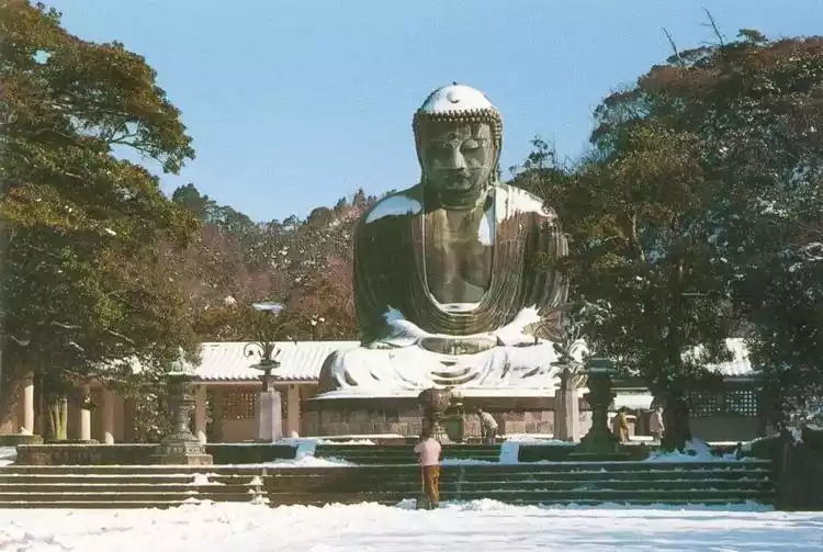 The 11.4-meter-tall bronze statue of the Buddha at Kotoku-in Temple is a landmark of Kamakura. It's said to have been erected in 1252 and originally enshrined within a vast hall. However, the hall was destroyed by the 1498 tsunami, and ever since then, the statue has gazed down upon the world, its head resting on the ground and its head resting on the sky.
