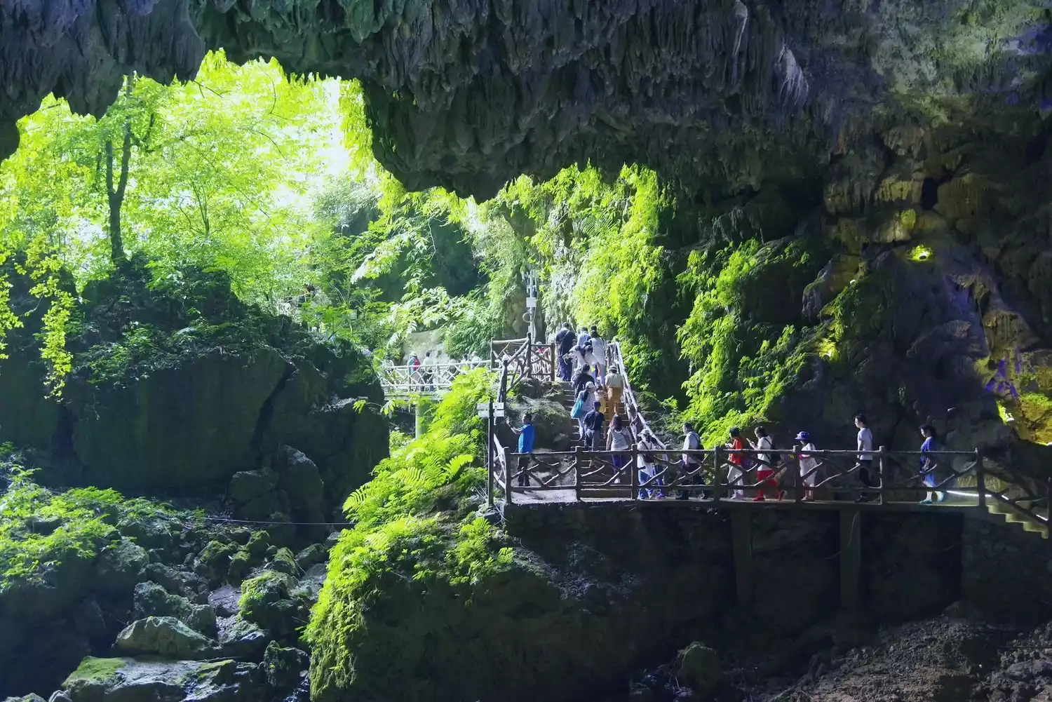 Turning back from the path below the Tongling Treasure Cave, you can see a ray of sky above and a surging underground river below!