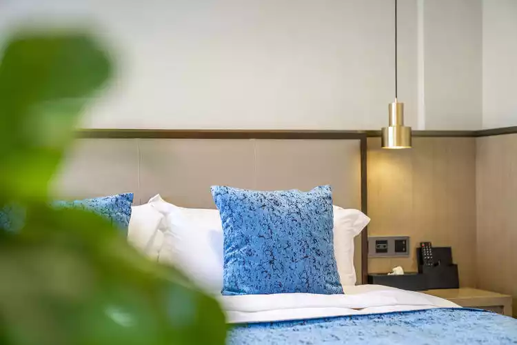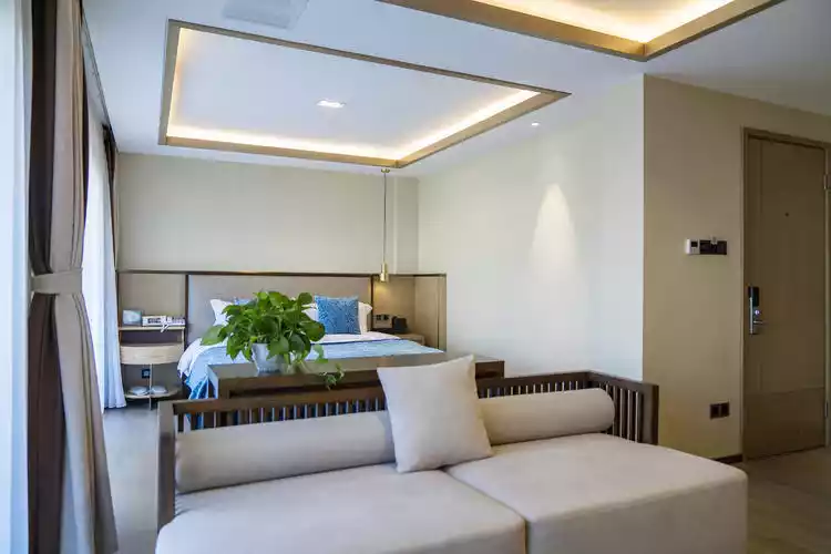 The simple design separates the living room and bedroom areas. The mattress is relatively hard, the bedding is soft and comfortable, and it is matched with high and low pillows.