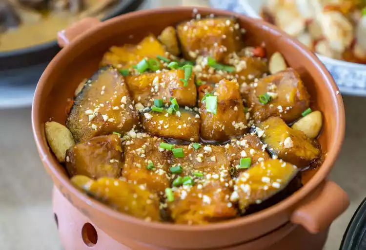 Chestnut and Pumpkin Casserole. There are actually no chestnuts in this dish. It’s the pumpkin that has a powdery texture, just like eating chestnuts. It is slowly heated in a ceramic pot to keep the residual heat. Later, part of the bottom of the pumpkin has become burnt, and it tastes better at this time.