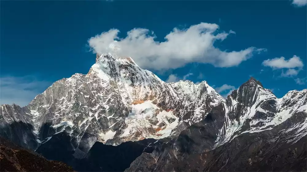 Siguniang Mountain is located in Aba Prefecture, Sichuan Province. It consists of four consecutive peaks in the Hengduan Mountains. The four peaks in the picture above are Yaomei Mountain with an altitude of 6,250 meters, Sanguniang Mountain with an altitude of 5,664 meters, Erguniang Mountain with an altitude of 5,454 meters, and Daguniang Mountain with an altitude of 5,355 meters.