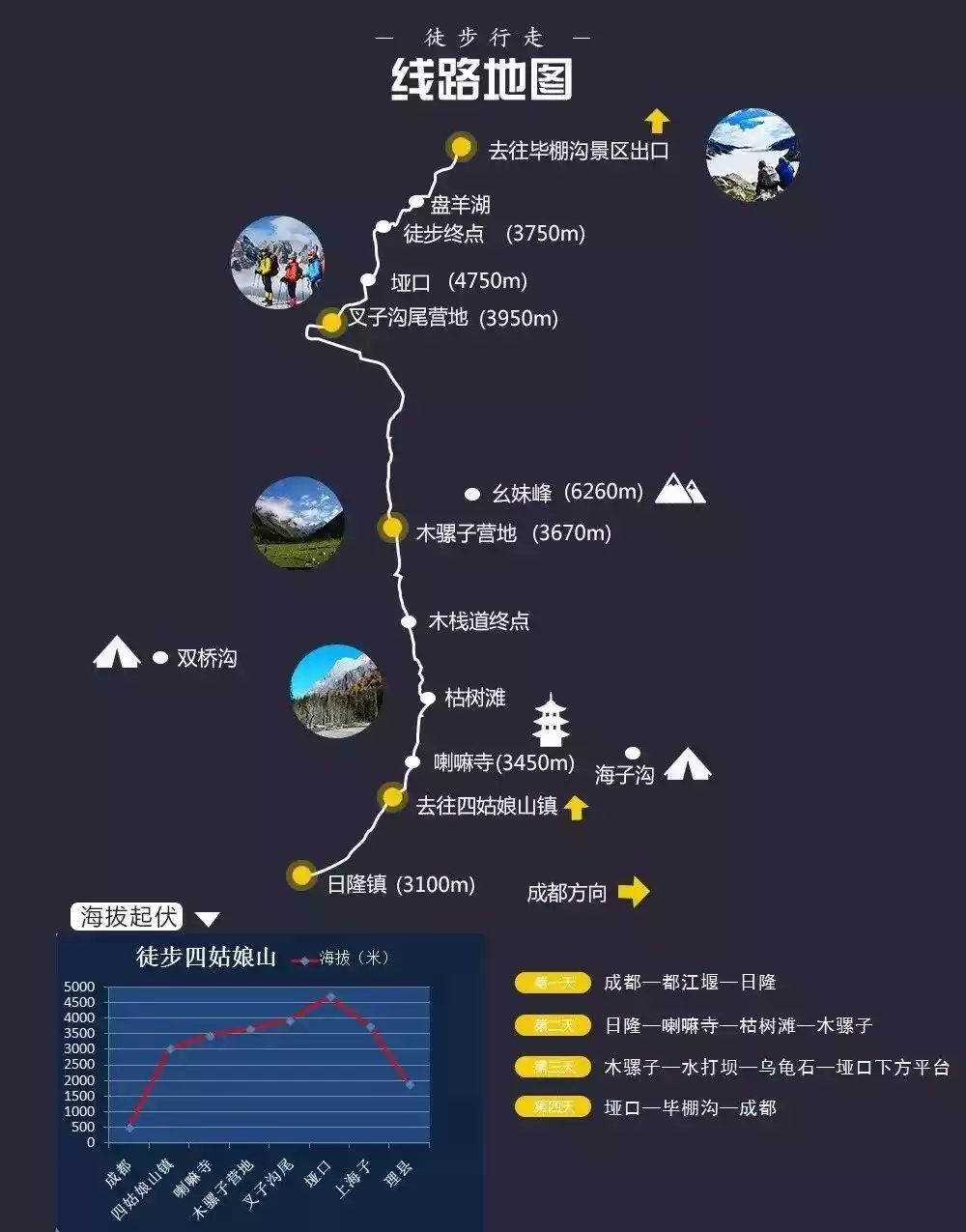 The route from Changpinggou to Bipinggou is about 40km long. Generally, you need to arrive at Rilong Town from Chengdu one day in advance. If you come to Chengdu from other places, the whole journey takes 5 days, of which the hike is divided into 3 days and 2 nights. The difficulty increases gradually every day. The end point on the first day is Mumulizi Camp, the end point on the second day is Chazigouwei Camp, and you reach Bipinggou on the third day.