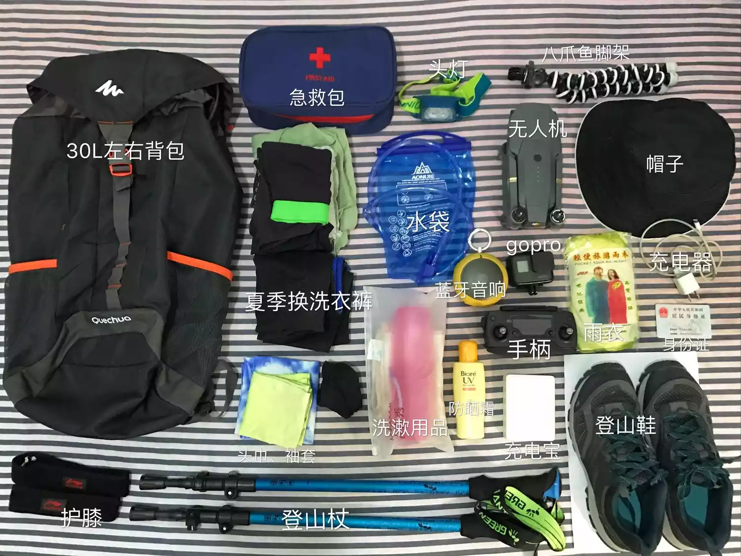(4) Personal belongings: 1L insulated water bottle or kettle + waterproof bag + sunscreen + fruit + power bank, beef sticks, chocolate and other energy supplies;