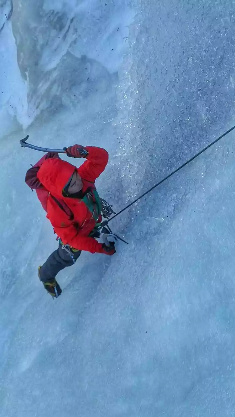 The kicking position is slightly wider than the shoulder, which makes it more stable when standing up. Kicking ice and supporting the feet rely more on the calf strength, so the calf will be sore after climbing. You can also do some standing heel raises to exercise the strength of the calf. After all, the strength of the human leg far exceeds that of the arm, and ice climbing is to use the leg strength as much as possible to climb up. Using the front tooth technique can get good support, and there is no need to kick out a hole to stand firmly. Newbies who do not have good ice kicking skills and do not trust crampons will waste a lot of time and energy on the ice kicking step.