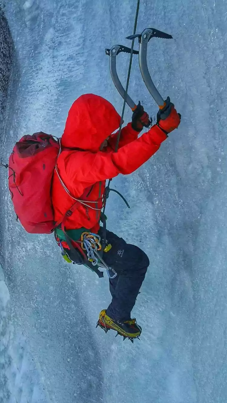 Facing the ice wall, tighten your arms and upper body, keeping your upper and lower arms aligned, and use your upper arms to drive your lower arms. The feeling of hitting the pick is similar to throwing a dart, swinging it out in one swoop. Hold your arms shoulder-width apart and hit the pick as high as possible. The ice pick should be placed on a flat or concave part of the ice wall for greater stability. Avoid placing it on a raised or bulged area, as this will create instability. Once firmly planted, straighten your arms and use your legs to squat, reducing arm force. Minimize locking your arms during climbing to conserve your strength.
