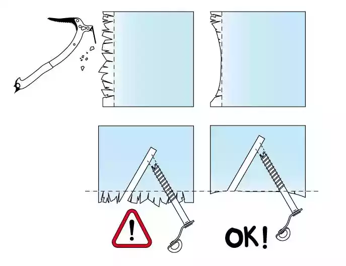 When climbing ice hooks, first knock off the unstable ice fragments on the surface, and then hit the relatively stable ice surface, or find a reliable hook point. If a line has been climbed several times, then congratulations, you can save a lot of effort by hooking along the way.