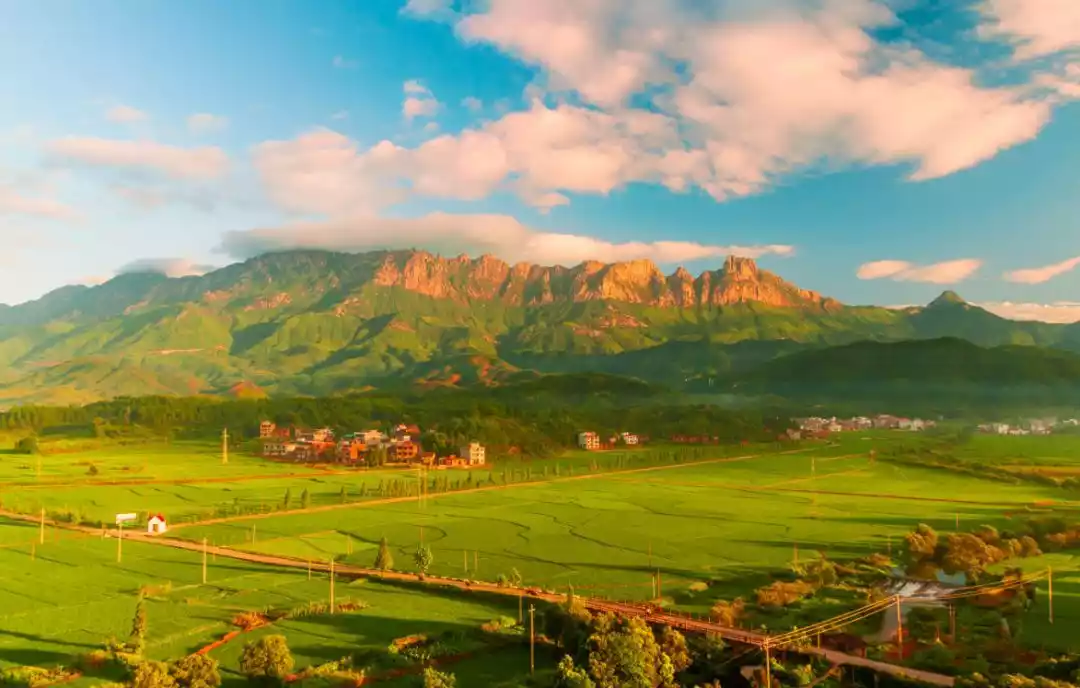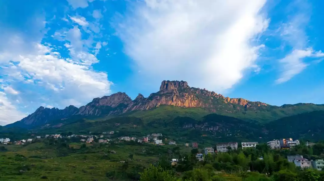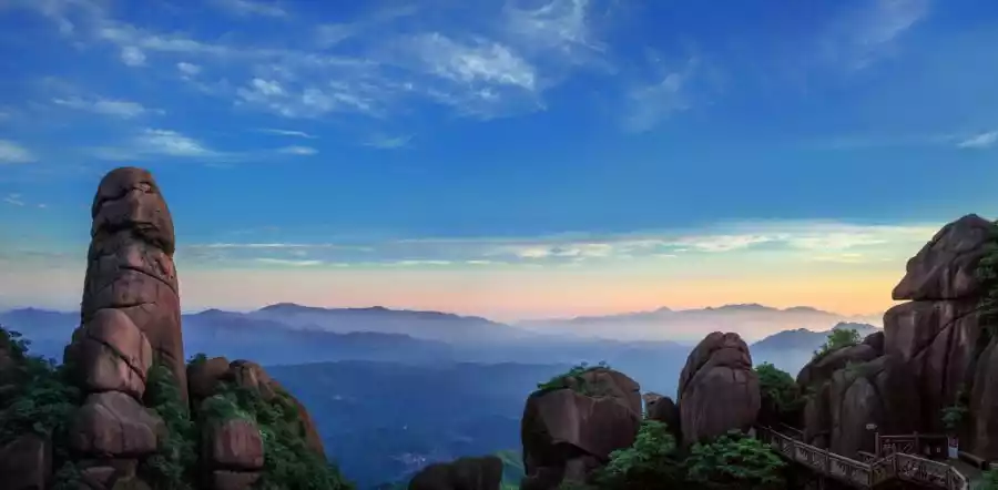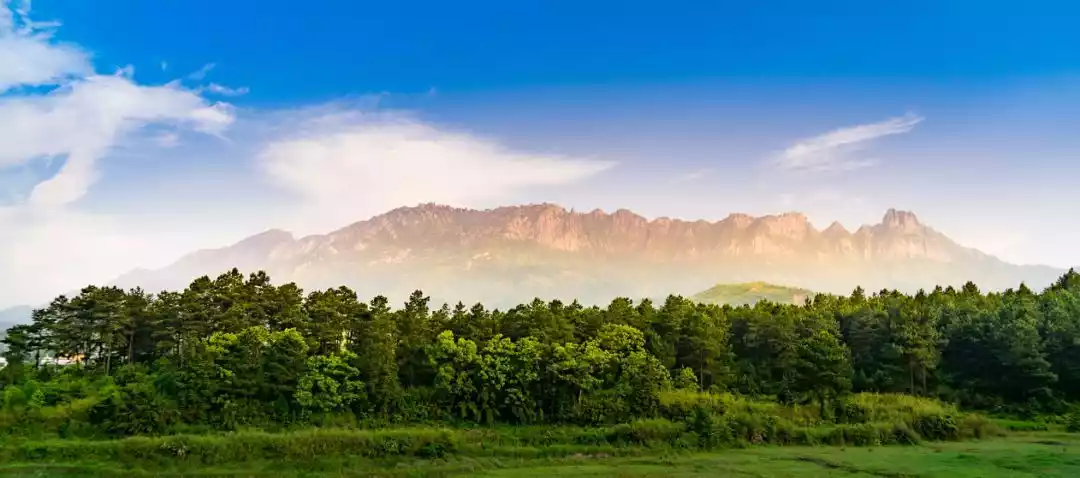 In Guangxin District, less than 30 kilometers away from the main urban area of Shangrao City, between Sanqing Mountain and Guifeng Mountain, in the rolling hilly area of Jiangnan, a group of steep peaks suddenly rise up, running in a northeast-southwest direction, drawing a graceful arc, like the upper Xuan moon.