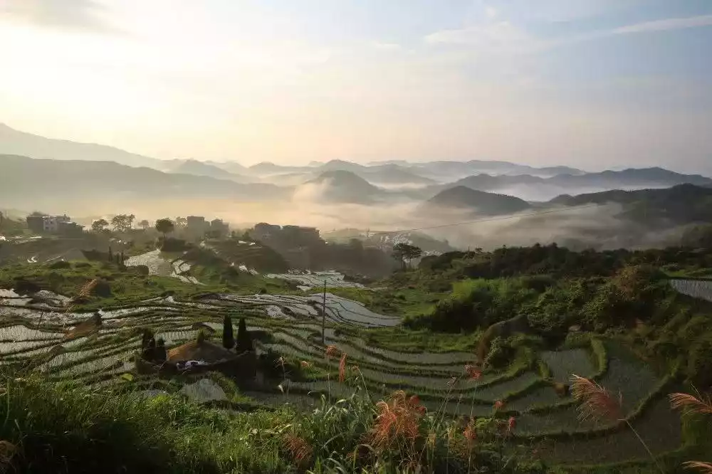 Looking out at the land of Shangrao from afar, the fields are crisscrossed, and the Mingyangguan Reservoir is like a string of emerald jade inlaid in it. The mountain breeze blows, and I can't help but feel refreshed. I just want to shout out how wonderful it is!