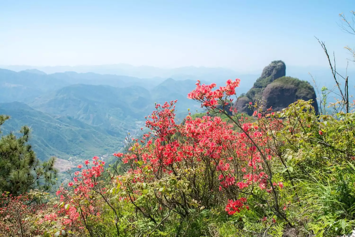 On the Moganshan Ancient Trail in Deqing, Hangzhou, Zhejiang, a massive rock rises majestically from the summit of Heniao Mountain, 785 meters above sea level. In late April and early May, Heniao Mountain is ablaze with wild azaleas and rhododendrons, creating a breathtaking spectacle.