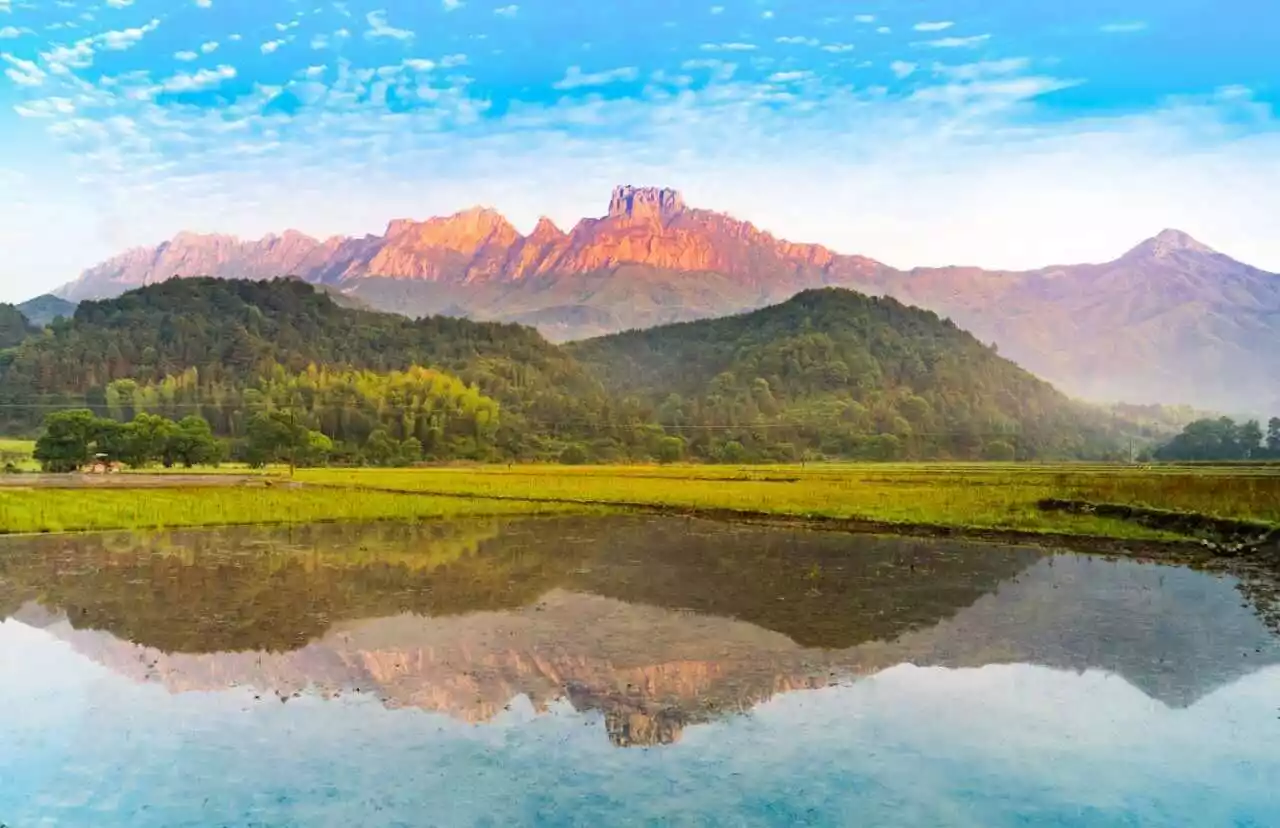 The highest peak "Taibai Peak" and the East Taibai Grand Loop are typical Jiangnan style. The mountain road is winding and there are gurgling water on both sides. There are continuous tea gardens not far away. Now it is spring. When you arrive at the Longmending farmhouse halfway up the mountain, you can find a century-old wild azalea king.