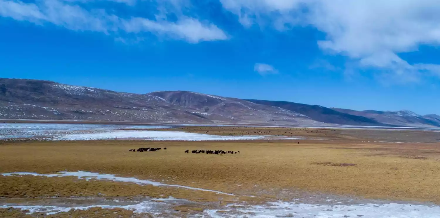 During the golden season of Qiangtang, from June to October, the temperature can reach 7-12°C. The weather is sunny and windy, the grass is lush, and herds of cattle and sheep are everywhere, making the scenery particularly pleasant.
