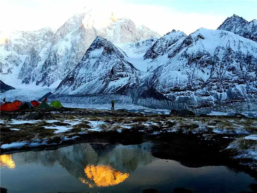 Don’t rush down the glacier that night. Instead, camp in the ancient barracks beside the ancient trail at the end of the glacier (there are many ruins of ancient barracks, the west walls of the houses are still preserved, but the roofs are gone, and tents can be set up inside the houses).