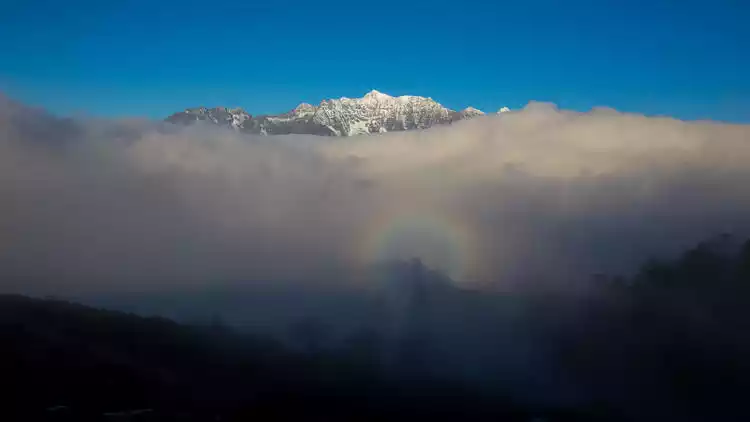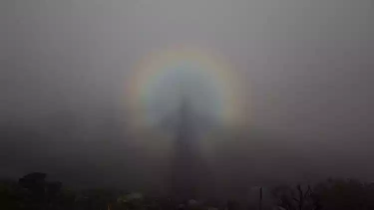 Under the right conditions, the sunlight shining through the clouds will cast your shadow on the clouds behind you, which may form the even rarer Buddha's light.