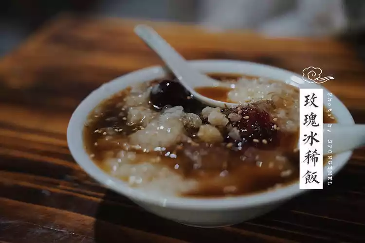 A base of brown sugar water is added to chilled glutinous rice porridge, topped with crushed ice, and sprinkled with sesame seeds, peanuts, various dried fruits, and rose jam. This is Chef Guo's signature dish, "Rose Ice Porridge."
