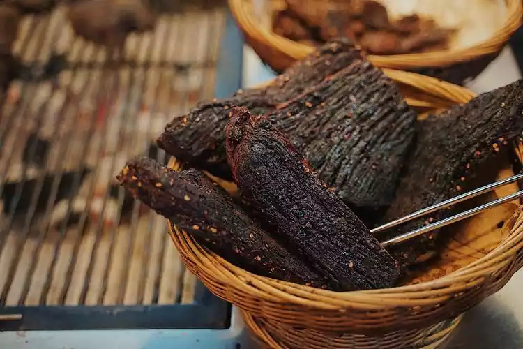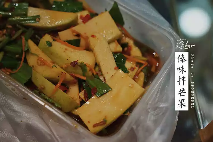 At the entrance on one side, there is a whole row of snack stalls: crispy and satisfying-looking pork belly roasted bait blocks, cool and fragrant bagged Thai milk tea, Dai-style mixed mango that is rarely seen elsewhere in Yunnan, and beef jerky that needs to be placed on a tree stump and hammered with a wooden hammer until soft before being torn apart... Many authentic Yunnan delicacies can be found here.