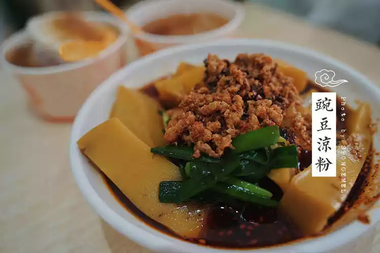 Hongji Cold Rice Noodles, a long-established eatery on Snack Street, features pea jelly as one of its signature dishes. Kunming's signature sweet soy sauce is used alongside sugar, vinegar, chili peppers, and a sprinkle of scallions and meat sauce, creating a colorful, refreshing, and delicious pea jelly dish.