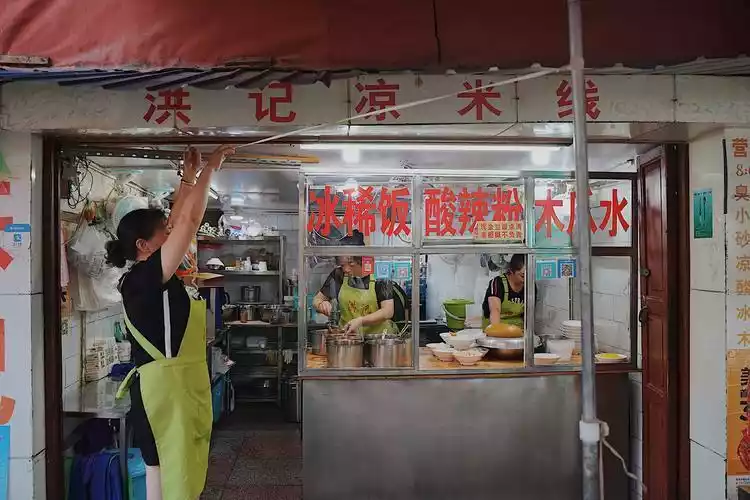 The long-established Jianxinyuan restaurant on Baoshan Street still sees long lines every day. Due to lack of space inside, many people simply sit on the small stools at the entrance and eat their rice noodles.