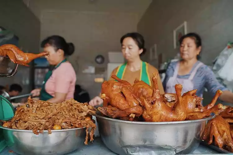 A 1-kilogram young rooster, freshly crowed, is carefully prepared and placed whole in a broth. When the time is up, the whole chicken emerges from the pot, golden in color, exuding the aroma of the blended meat and herbs. Every morning, these braised chickens are piled prominently in front of every shop, becoming the shining golden signboards of every household on the streets of Zhuyuan Town.