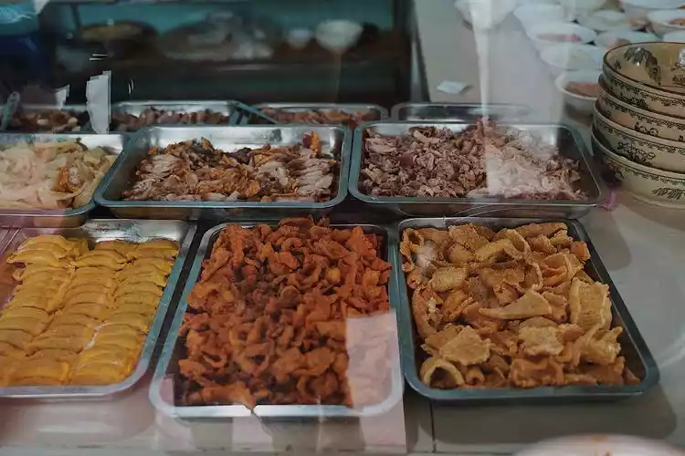 Inside the glass window, you can choose from golden pig's feet, fried pork skin, crispy pork, pork tenderloin, egg dumplings, etc. If you are not following the locals in front, it would be really difficult to make a decision.