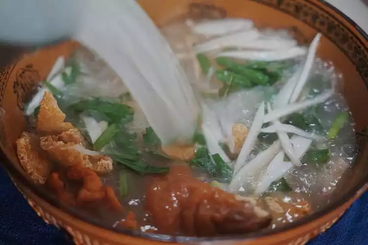Unlike Cross-Bridge Rice Noodles, the pork bone broth here has been skimmed of oil, leaving only the essence of the bone broth, which is refreshing and rich. After being immersed in the broth, the tiny holes on the meat, which have been deep-fried over high heat, eagerly absorb the moisture. With one bite, the broth overflows, and the aroma of the meat is fragrant.