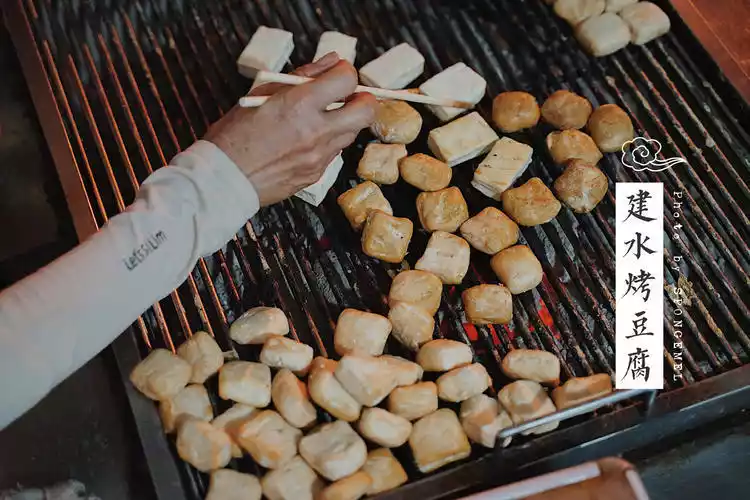 Tofu stalls can be found in every street and alley of Jianshui. A round or rectangular iron tray sits atop a traditional local cooking utensil—a fire pit. Pieces of tofu, lightly coated with oil, are grilled on top. The owner sits on one side of the fire pit, fanning the flames with one hand while deftly turning the tofu with a pair of long chopsticks in the other. Diners gather around the stove, scooping up a cooked piece with their chopsticks, dipping it in chili sauce, and popping it into their mouths. The stall owner, with one free hand, drops a kernel of corn or soybean into a small jar in front of the diners, counting the cost. The clang of the tofu dropping into the jar and the occasional sizzling of the charcoal fire create a harmonious symphony at the tofu stall.
