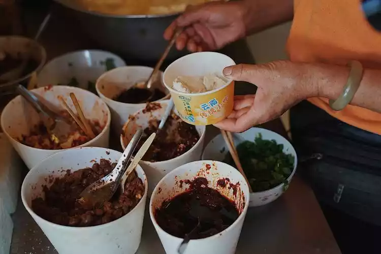 Thin, dry rice noodles are tossed with bean sprouts, chives, chili oil, soy sauce, sesame oil, vinegar, and other seasonings, then quickly served and mixed. Each thin strand, perfectly straight and smothered in the vibrant color of the sauce, looks incredibly appealing. Picked up with chopsticks, the noodles playfully slip through the chopsticks, making eating them both an enjoyable and challenging endeavor.