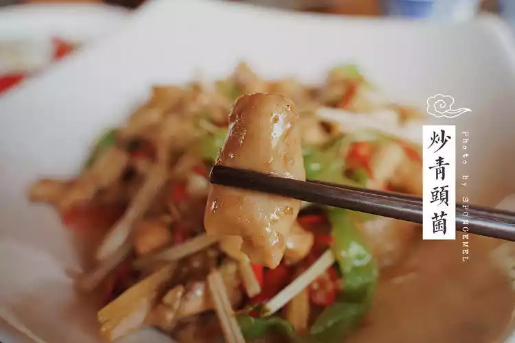 The cap is a light green, with a hint of green still visible even after being cooked. The mushroom has a plump, tender texture, and the fibers exude a refreshing mountain aroma. Adding plenty of oil and stir-frying with chili peppers and celery, the flavors of the ingredients complement each other beautifully.