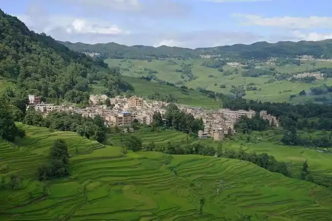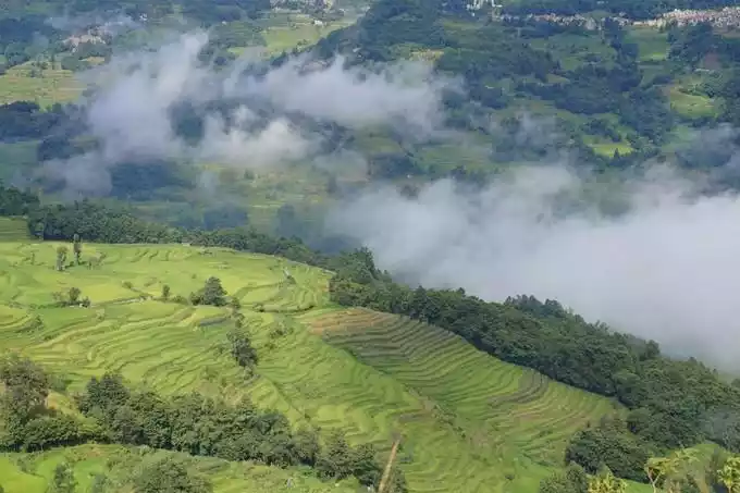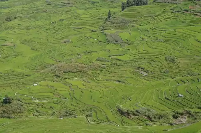 When we finally stopped the car and looked out, we saw rolling green hills, and the emerald green rice paddies, divided into neatly arranged shapes, stretched out layer by layer into the distance. The rice paddies and the sky seemed very close, getting closer and closer as the distance extended, finally embracing each other at the end of our sight.