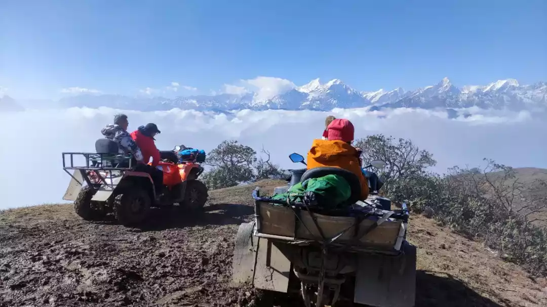 Huajian Mountain, with an altitude of 3,450 meters, is located on the southeast side of Gongga Snow Mountain, next to Niubei Mountain. It takes about 4-5 hours to hike up the mountain. You can also choose to take a local all-terrain vehicle up the mountain. The view from the camp on the top of the mountain is very wide, and you can see all the snow-capped mountains.