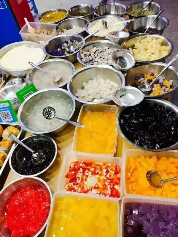 The ingredients of the sweet soup include taro, sago, water chestnut cake, red beans, mung beans, grass jelly, locust flowers, etc. Customers can prepare it by themselves and then add coconut milk or brown sugar water. A bowl of sweet soup costs only three to five yuan.