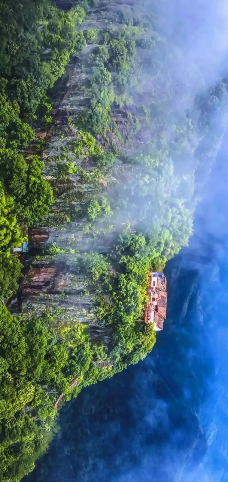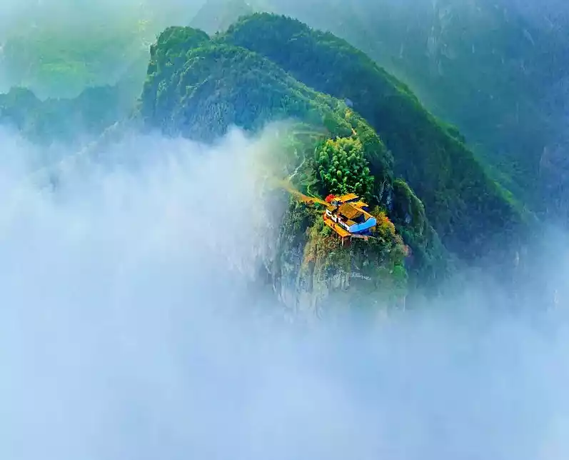 To facilitate the entry and exit of the mountain residents and the worship of believers, more than 2,800 stone steps were built on the mountain, leading directly to the top. After passing the Ma'an Pavilion, a steep cliff path with three sides of the mountain hanging in the air is even more mysterious in the mist. On the top of the mountain, a Xiaohuang Temple has stood alone on the peak for 1,500 years. Although it is in decline, it still has incense burning, overlooking the vicissitudes of the world over the past thousand years.