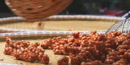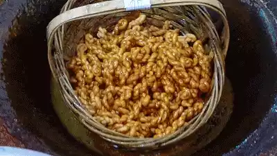 While Jiangsu residents master sugar, Yiwu residents use it more simply and crudely. Freshly fried mahua (fried dough twists) are topped with a generous spoonful of freshly refined brown sugar, coating each twist evenly. The sugar coating is sweet and delicious, while the twists are crispy on the outside and crunchy on the inside. The sweet brown sugar can even be pulled into strings!
