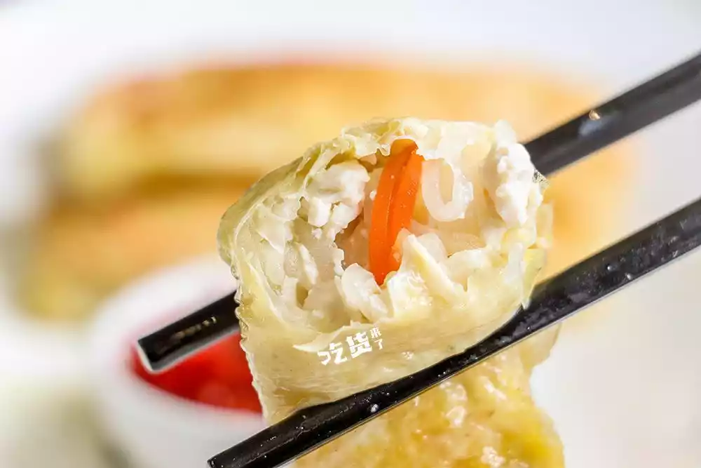 The [Bean Curd Skin Vegetarian Bun] is also very popular in Yiwu. A sheet of premium bean curd skin is wrapped around marinated tofu and topped with chopped radish, amaranth, and other seasonal vegetables. Freshly wrapped, fried, and eaten, it's crispy on the outside and tender on the inside, with a fragrant aroma of beans and vegetables—a flavor you can only find in Yiwu.